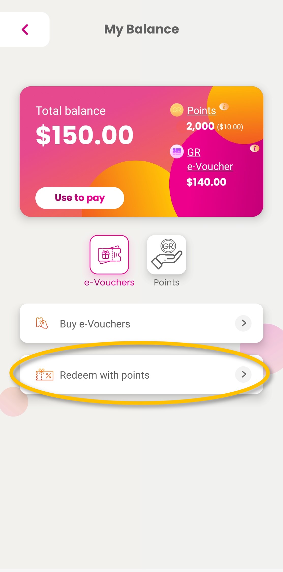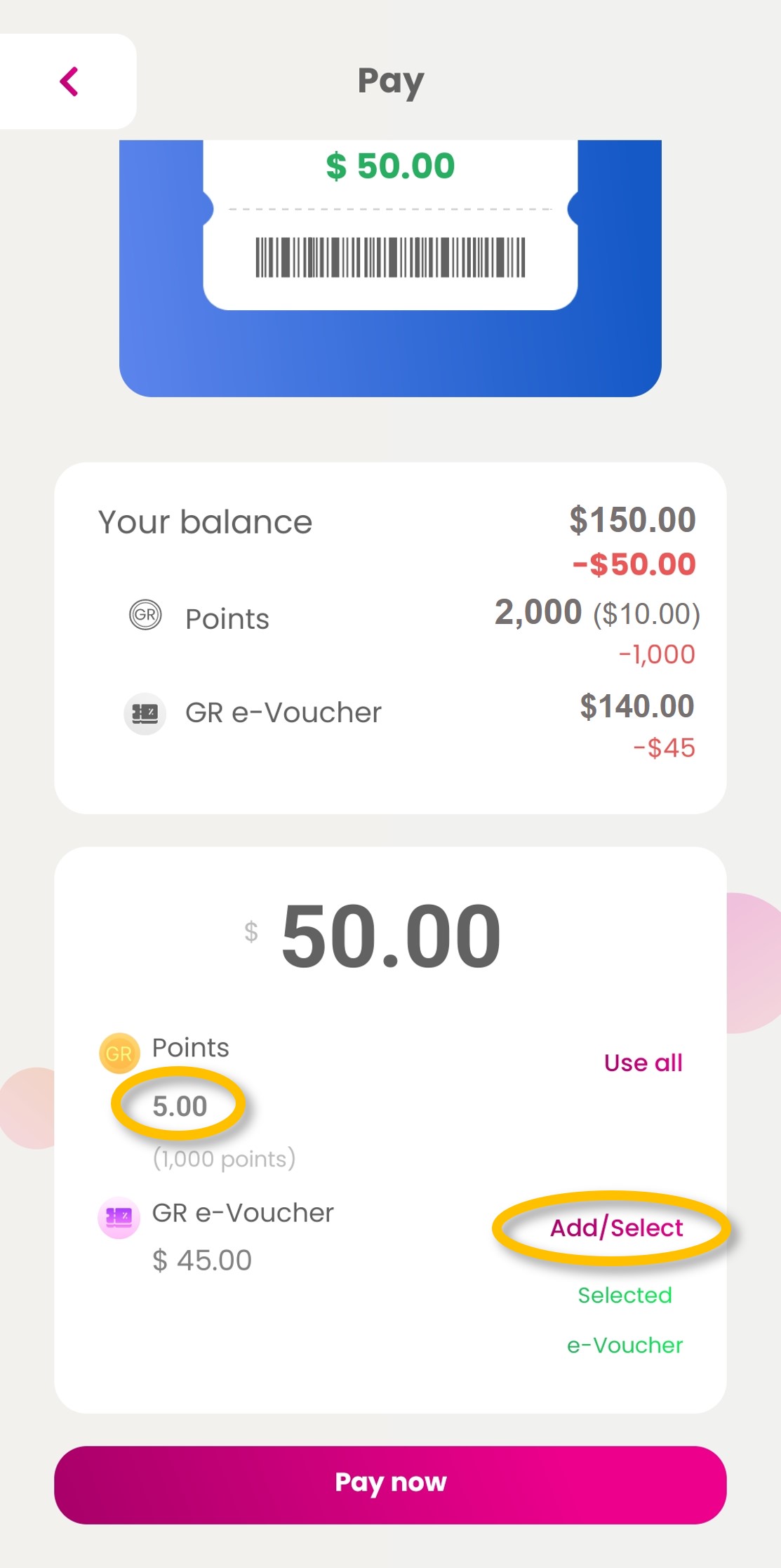 | Step 3: Input the value of points and/or select e-Vouchers you want to use and tap on ‘Pay now’.