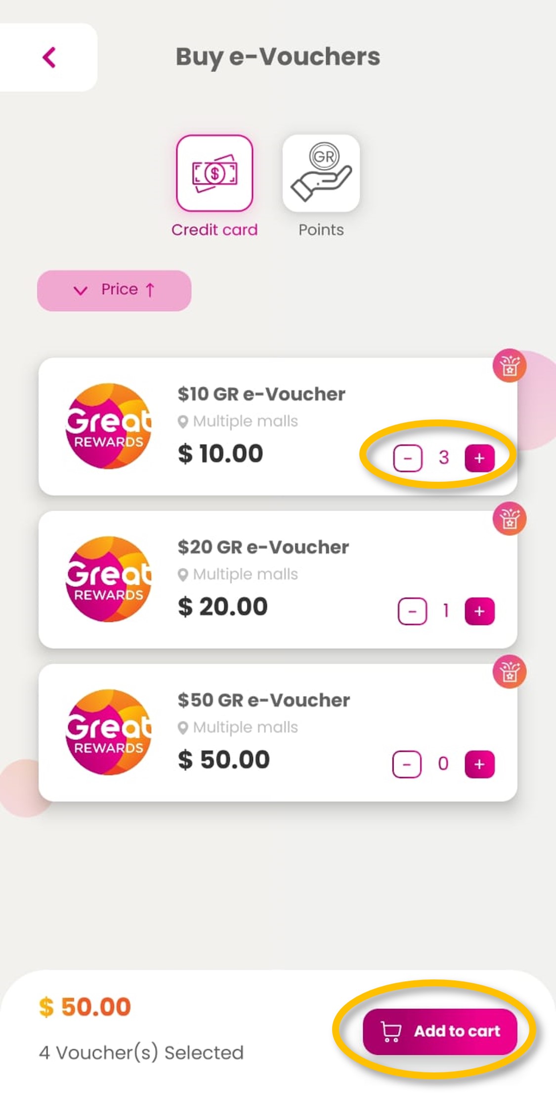 | Step 2: Select preferred denomination and quantity and click ‘Add to cart’.