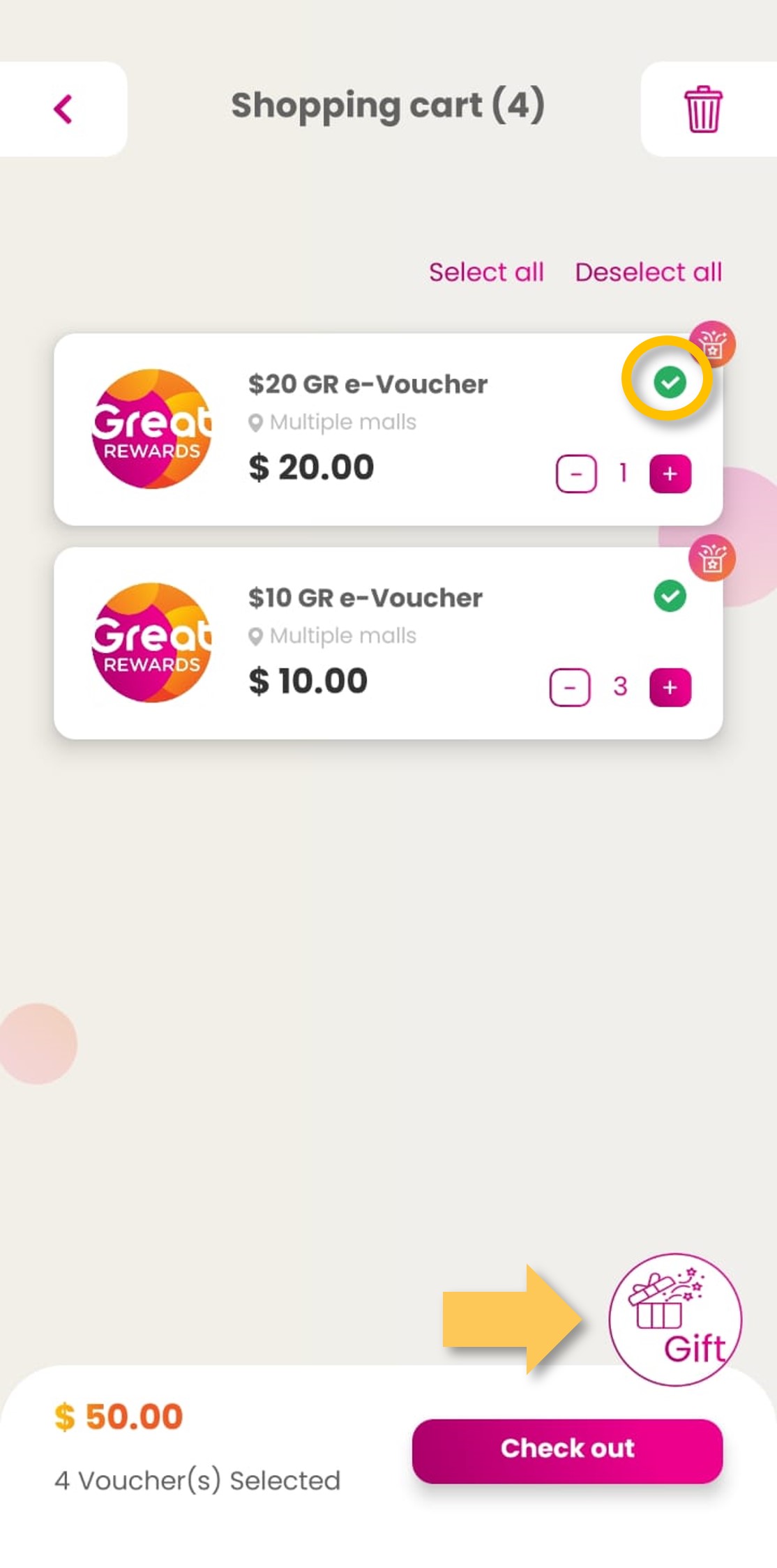 | Step 3: Select items and click on ‘Gift’ icon.