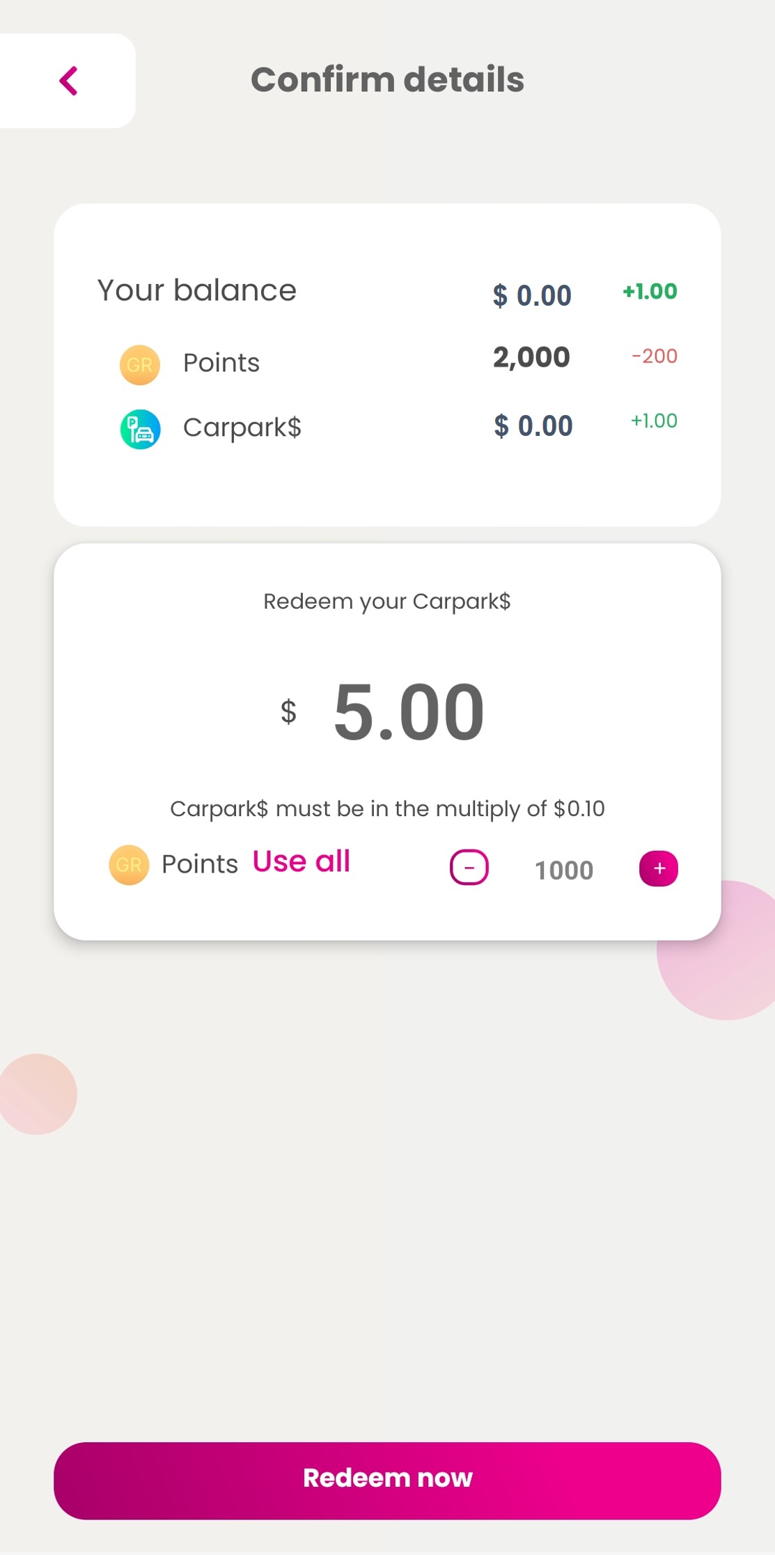 | Step 3: Enter Carpark$ amount you want to redeem and tap on ‘Redeem now’.